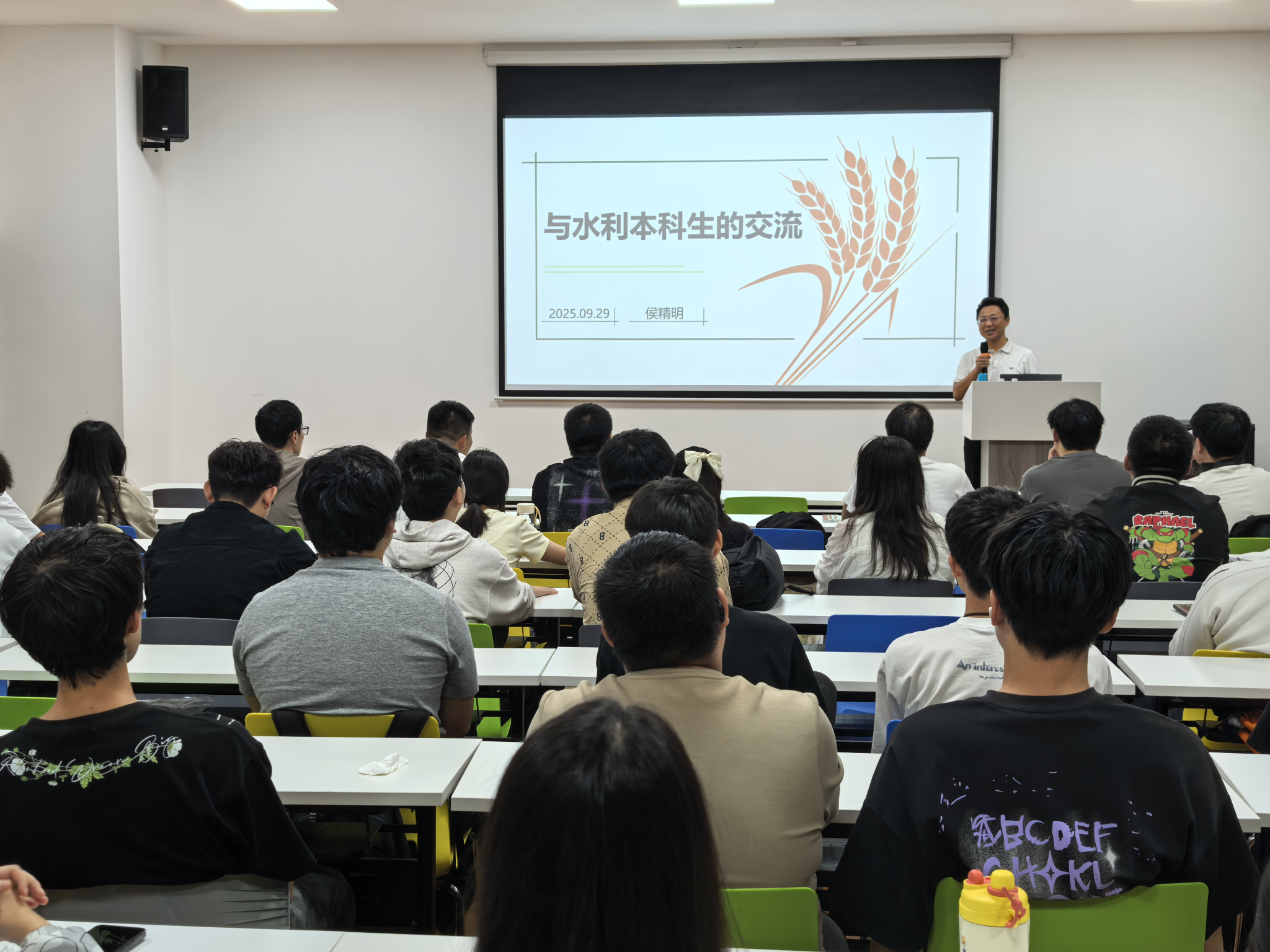 讲座中,侯精明教授结合自身经历,从五个维度深入分享人生感悟与成长心得。谈及“家国情怀、志存高远”,他动容回忆起阅兵式上目送国旗升起的庄严瞬间,特别叮嘱水利专业学子:“要立大志、明大德,将个人理想融入国家重大战略需求,方能让青春价值在服务水利事业中充分彰显”;围绕“乐观上进、内心坚韧”,他着重阐述培养积极心理品质的重要性,鼓励学生以平和心态面对学业挑战,“每一次困难都是突破自我的成长契机”;在“强健体魄、身心健康”部分,他结合求学与工作历程,为同学们支招:“制定科学运动计划,善用课间、课后等碎片化时间锻炼,让健康体魄成为逐梦的坚实基础”;谈及“学有所思、注重实践”,他以实际水利工程建设案例为引,强调“理论知识需扎根实践土壤,唯有在实践中检验、反思,才能真正学深悟透”;而“与时俱进、拥抱科技”的分享,则自然衔接至行业前沿内容——在“洪涝过程系统模型与智慧防御方法”讲解中,侯精明围绕洪水内涝全过程系统化模拟,结合AI快速预报、智能值守、智能运维、智能管理等关键技术,用通俗语言为学生科普水利科技的创新方向。