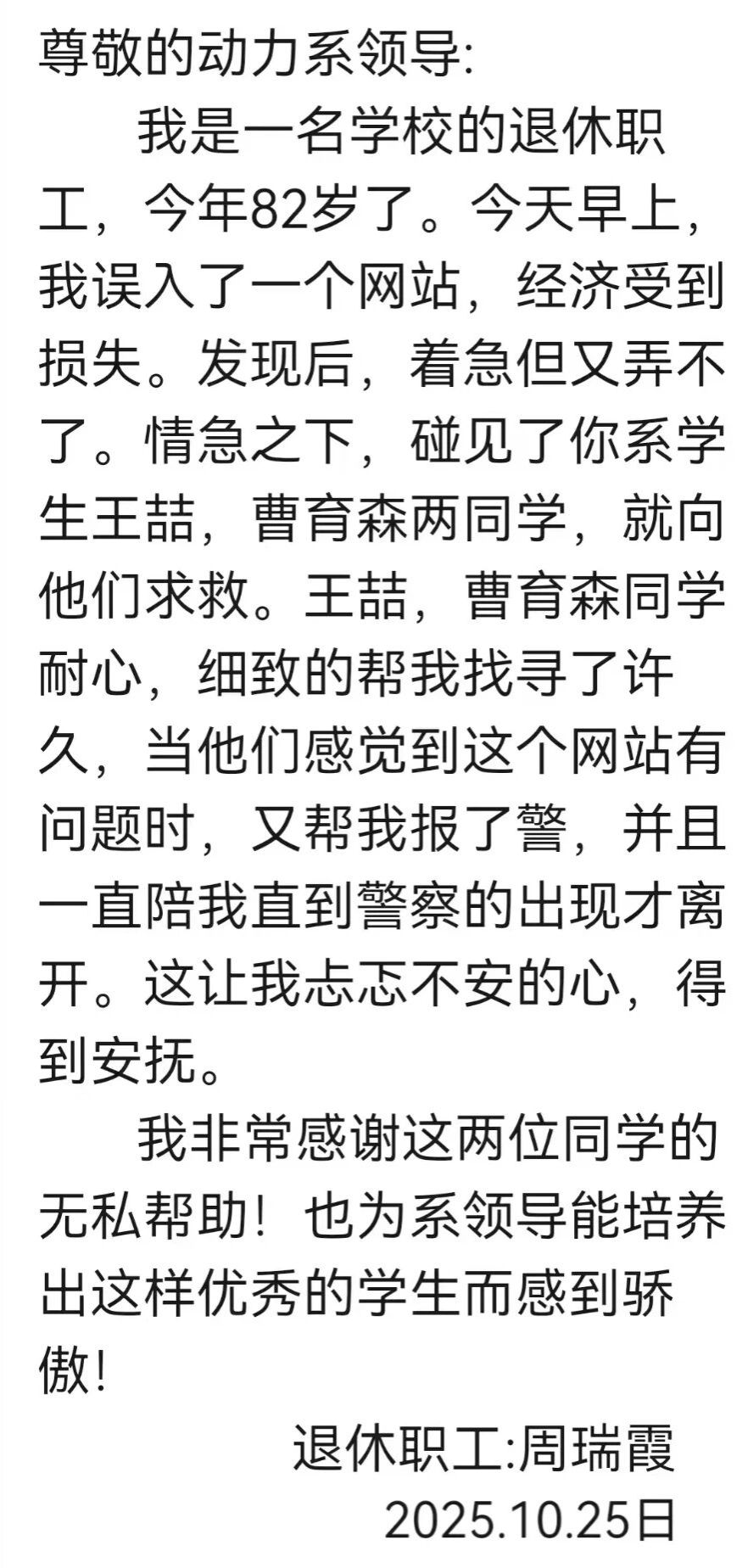当天下午,周老师送来一封手写感谢信:“这让我忐忑不安的心,得到了安抚……非常感谢这两位同学的无私帮助!也为学院能培养出这样优秀的学生而感到骄傲!”这封落款2025年10月25日的信件,字迹工整,情感真挚。信纸背后,是一位老教师对年轻学子最真诚的认可。