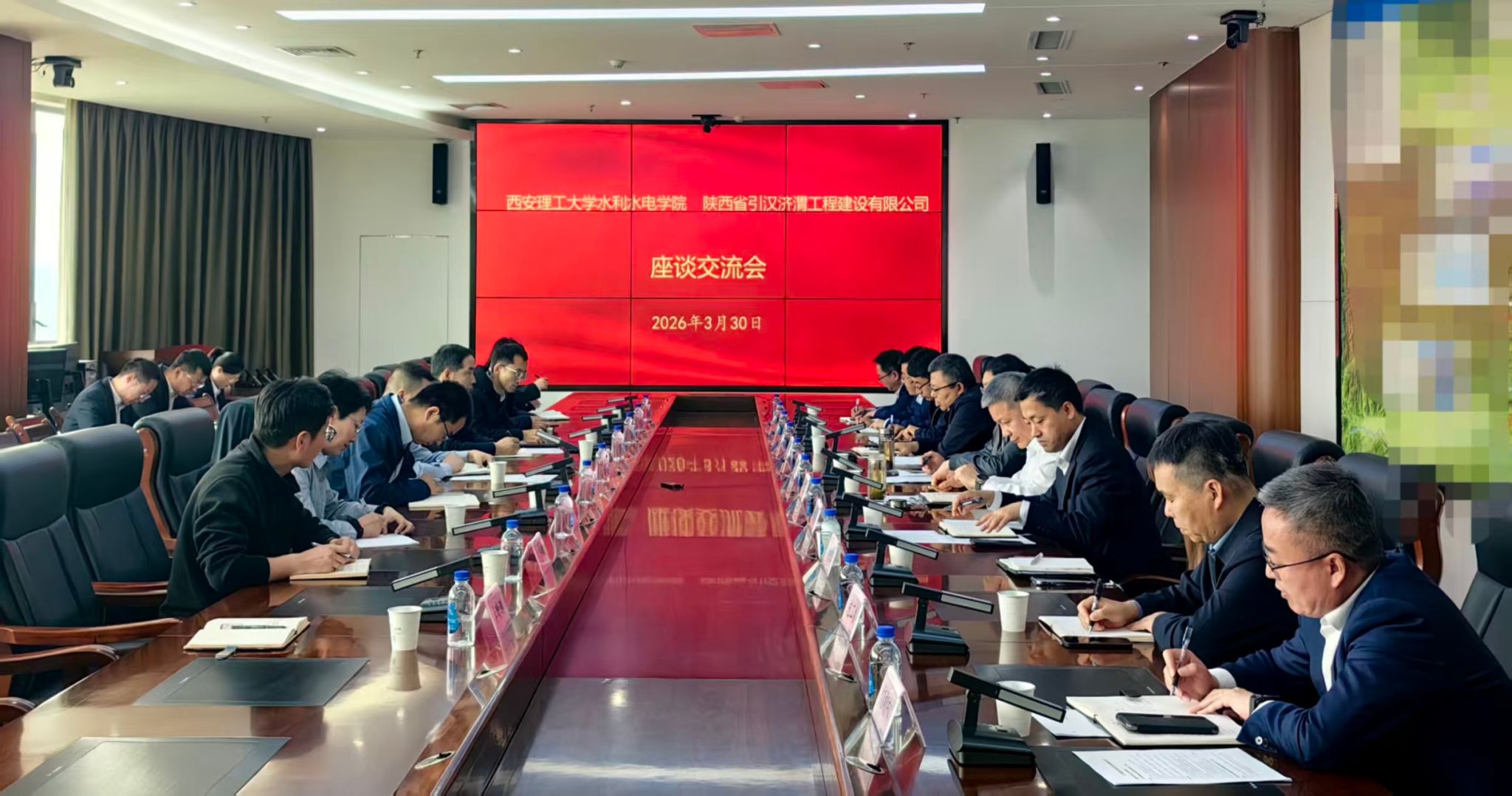 3月30日,水利水电学院院长李炎隆带队赴陕西省引汉济渭工程建设有限公司走访调研,与引汉济渭公司党委副书记、董事长、总经理韩宏,党委副书记、工会主席、职工董事张荣斌,党委委员、副总经理李晓峰,副总经理、总工程师曹双利等座谈交流。水电学院副院长徐国策、郭梦京参加座谈。