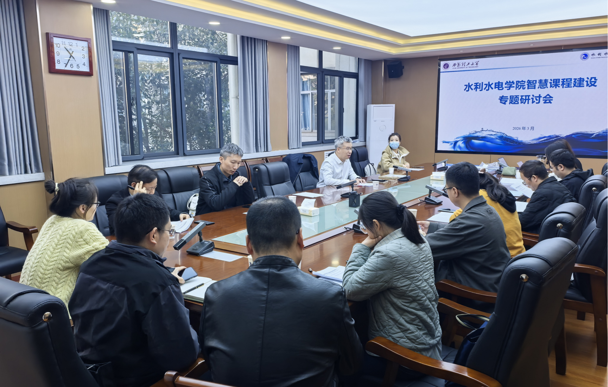 3月31日,水利水电学院在教四楼226会议室召开2026年智慧课程建设专题研讨会,聚焦“AI+水利”课程体系建设,持续推进课程与专业内涵式发展。会议特邀智慧树专家团队作专题报告,学院教学主任、系所骨干教师参加会议,共同探讨智慧课程建设路径。会议由院长助理颜建国主持。