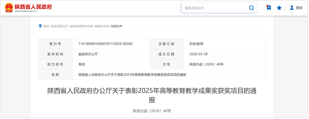 近日,陕西省人民政府办公厅正式公布《陕西省人民政府办公厅关于表彰2025年高等教育教学成果奖获奖项目的通报》(陕政办函〔2026〕40号),西安理工大学水利水电学院2项成果荣获特等奖。获奖成果分别为《全面、深度、共赢的校企合作水利卓越工程师培养模式构建与实践》《数智赋能、项目牵引、学科交融,培养“顶天立地”创新型水利人才》,彰显了学院在水利水电高等教育教学改革方面的突出实力和深厚积淀。