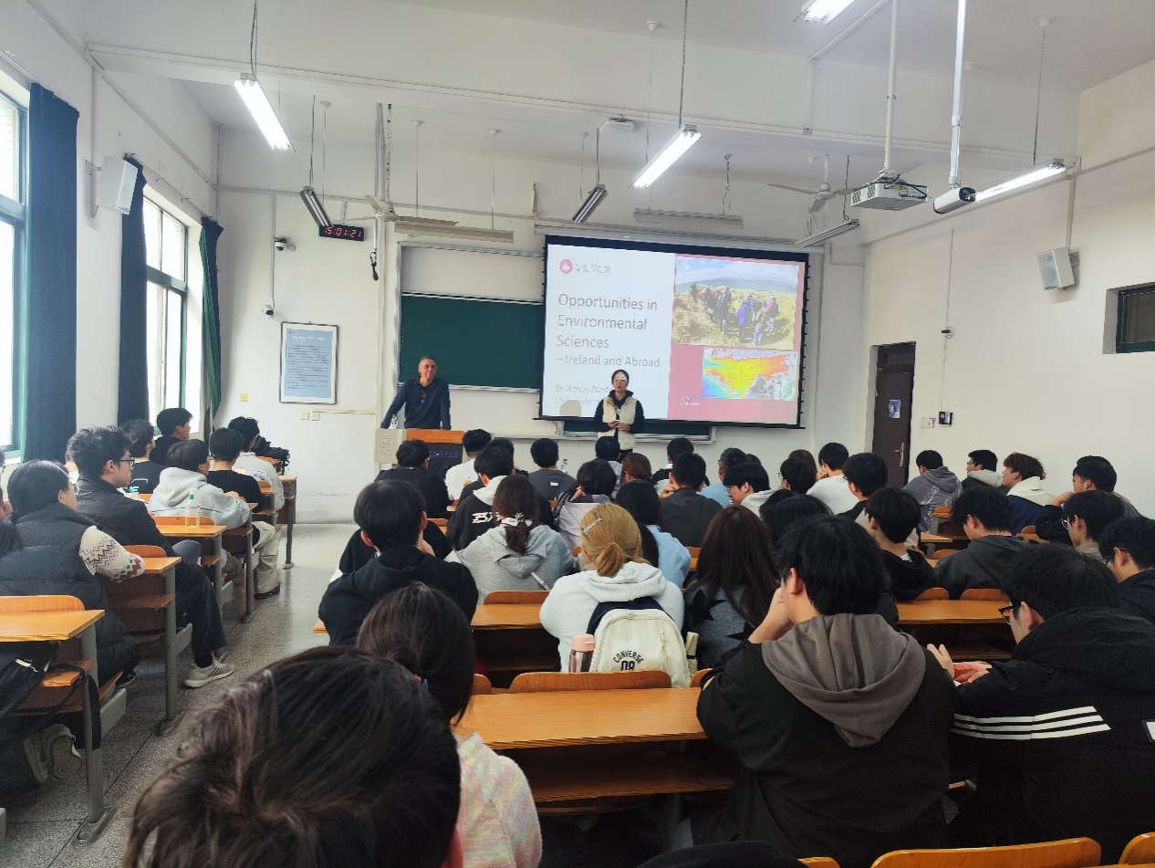 在报告中,Potito教授围绕海外环境科学及相关学科的发展趋势、行业前景与就业路径,系统介绍了戈尔韦大学生态环境相关专业的课程体系、人才培养模式与毕业要求,并分享了该校近年在科研布局与代表性成果方面的进展。他鼓励学生进一步拓宽全球视野,将课程学习与科研训练、行业实践紧密衔接,以国际视野理解气候变化、生态修复、水环境治理等全球性议题。他结合案例介绍了学生可参与的研究项目与实践机会,并就申请通道、语言与学术准备、实习与职业发展等给出具体建议。Potito教授欢迎我校优秀学生赴戈尔韦大学交流学习,期待在环境相关领域与我校开展更为紧密的合作。